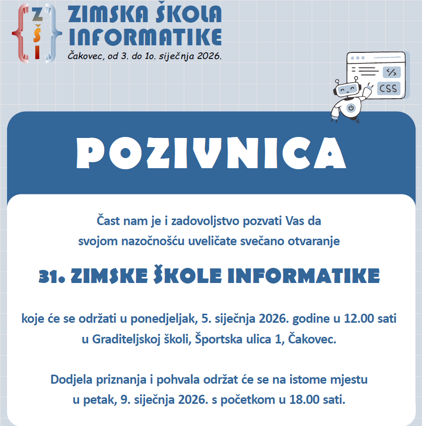 Pročitaj više Graditeljska škola Čakovec je peti put domaćin zimske škole informatike. Ovo događanje okuplja najbolje mlade informatičare iz cijele Hrvatske u organizaciji Hrvatskog saveza informatičara u...